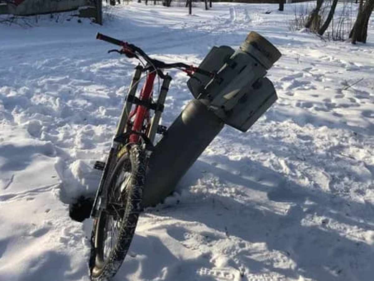Un ciclista usa un misil ruso de aparcabicis