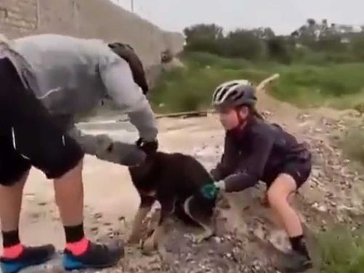 Unos ciclistas salvan a un perro atrapado en una botella de plástico.
