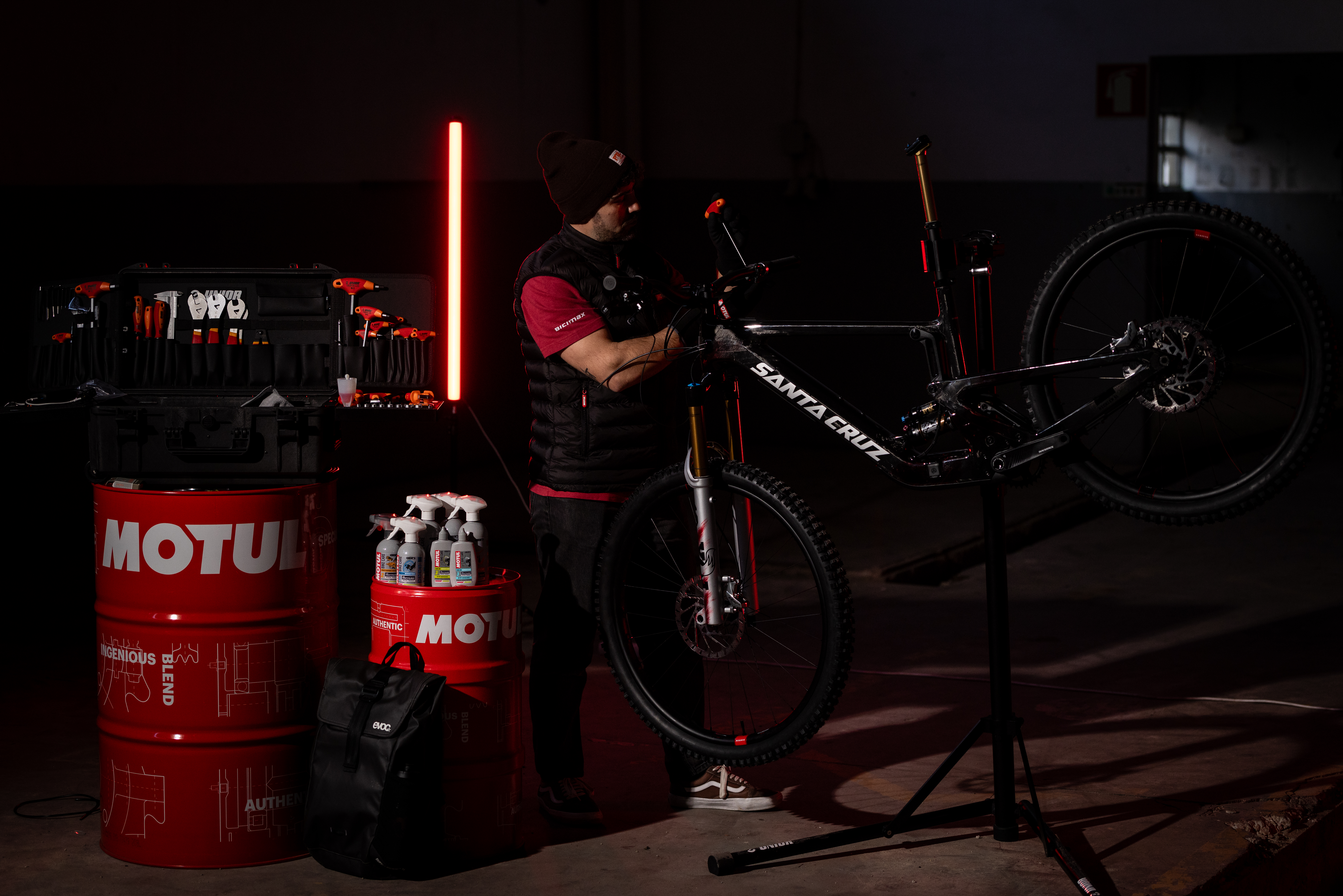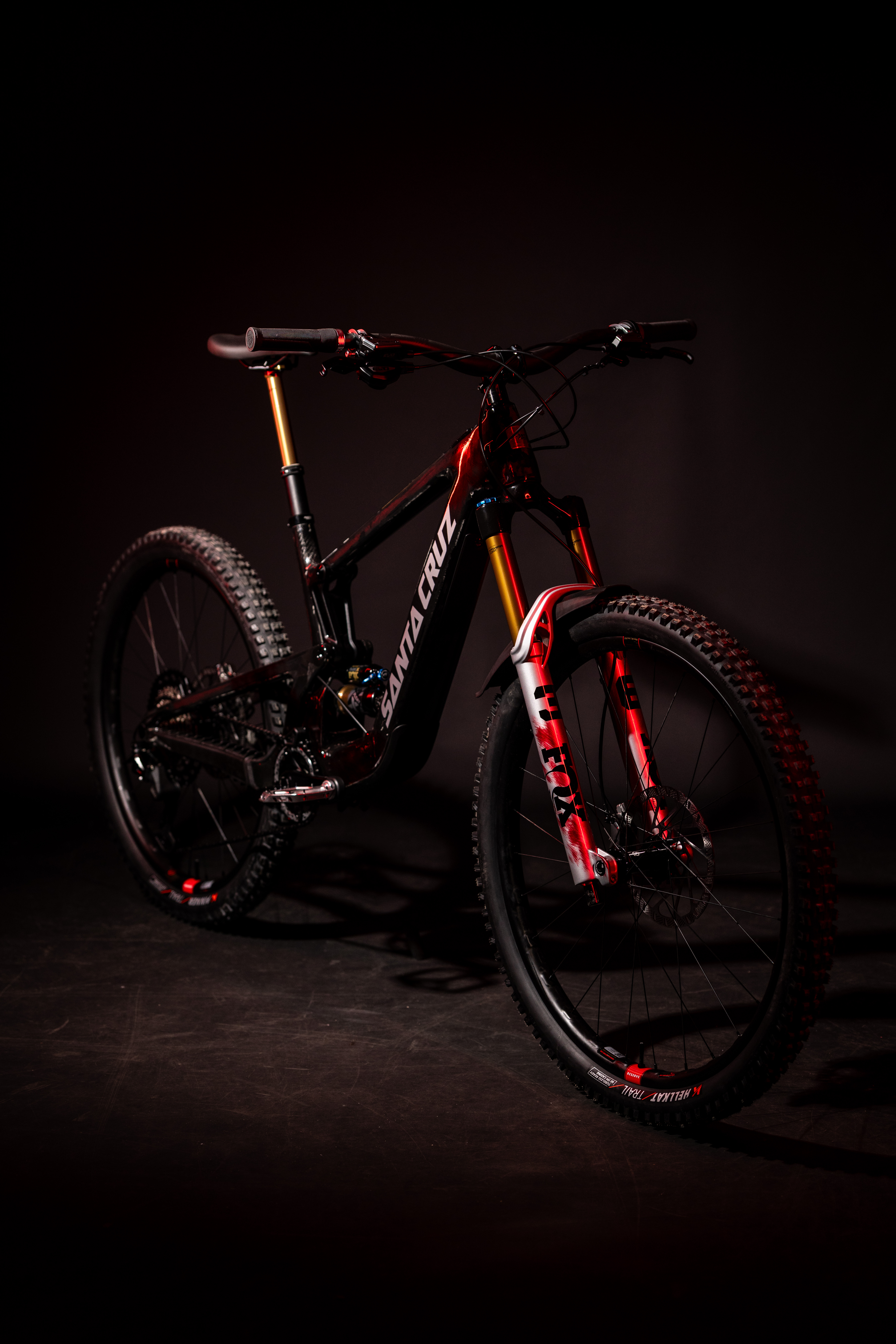 La elegida es una Santa Cruz Heckler SL, equipada con la nueva FOX 36, y rematada con un trabajo de pintura personalizado desarrollado junto a Edit Velo Girona. No es una bici de catálogo ni una edición especial: es una unidad irrepetible, diseñada al detalle tanto a nivel técnico como estético.