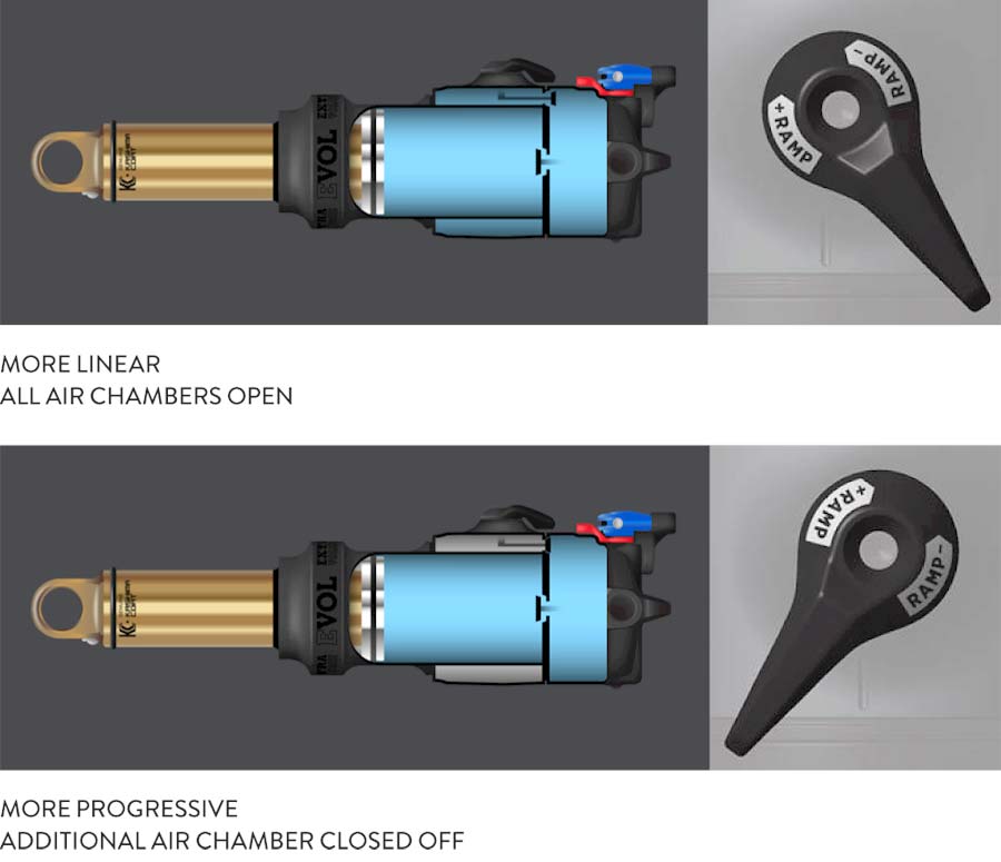 Gracias al Twinloc se puede bajar el recorrido a 120 mm para subir, un segundo modo que endurece ambas suspensiones y por último un bloqueo total de ellas. La geometría cambia 1,5º en el ángulo de sillín y dirección, y 20 mm en la altura de pedalier. En la parte alta del amortiguador lleva una fijación excéntrica en dos posiciones que hay que cambiar si cambiamos de tamaño de ruedas.